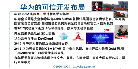 任正非今年还有很多注目行动,访问了很多大学,为什么呢?这就是要从基础研究抓起,同时提出投资20亿美元搞可信计算和可信软件工程。可信计算这个名称,在英语里面有好几种说法,实际上谈的都是同一回事,自微软提出后,已有大量研究成果,有关可信计算的国际会议名目很多。光可信计算的出版物就超过200本,可见这是一个很大宽厚的研究领域。